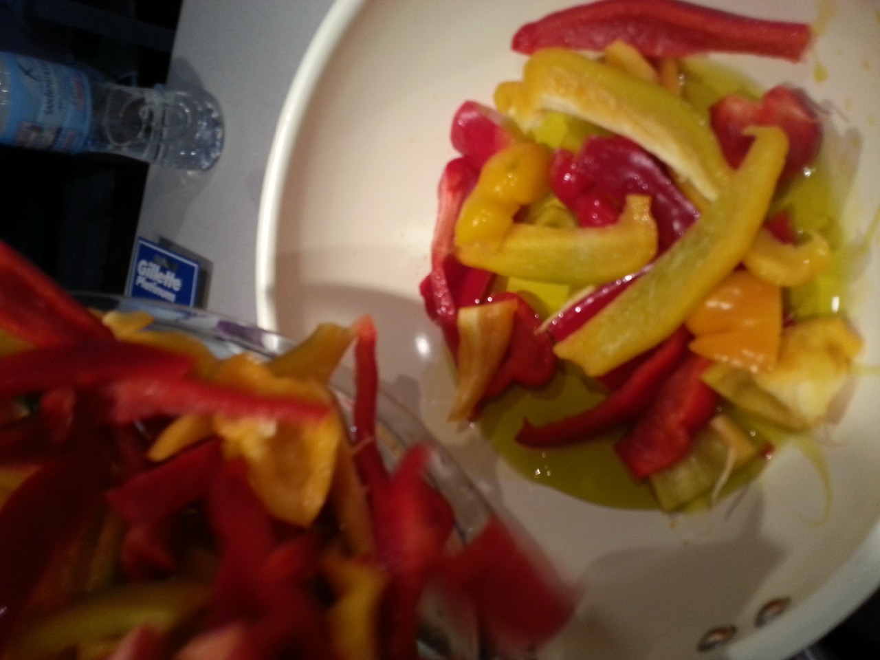 SEMPRE IN UNA TEGLIA CON DELL'OLIO, STENDETE L'IMPASTO AGGIUNGETE I PEPERONI (NON METTETE TROPPO OLIO DEI PEPERONI O L'IMPASTO SARA' TROPPO UMIDO.