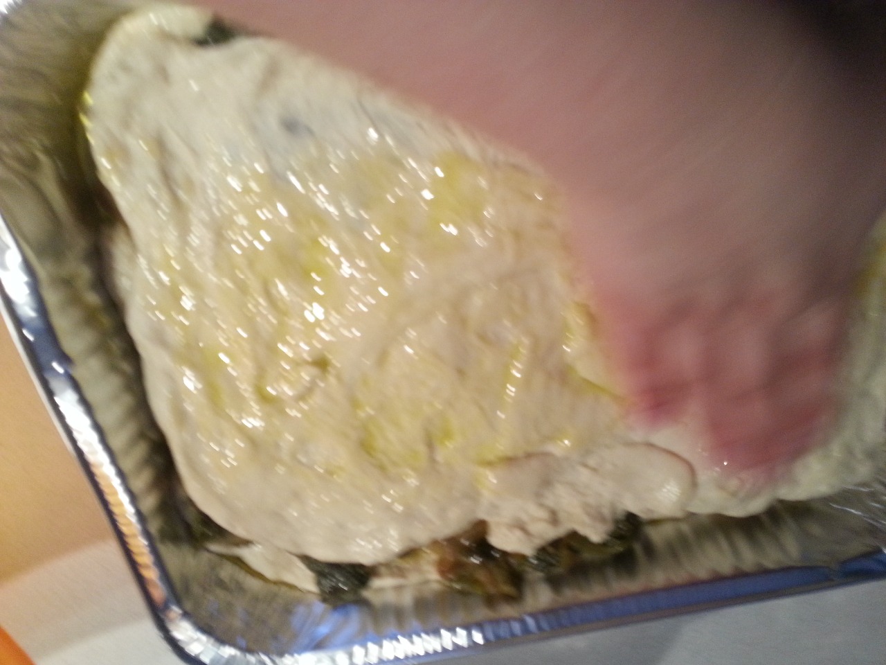 IN UNA TEGLIA AGGIUNGETE DELL'OLIO. STENDETE L'IMPASTO.